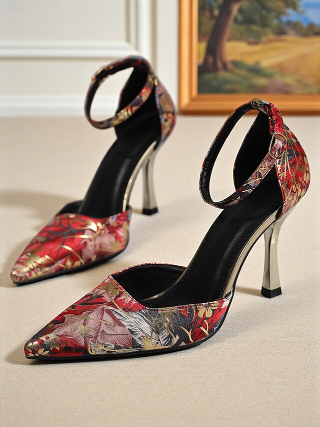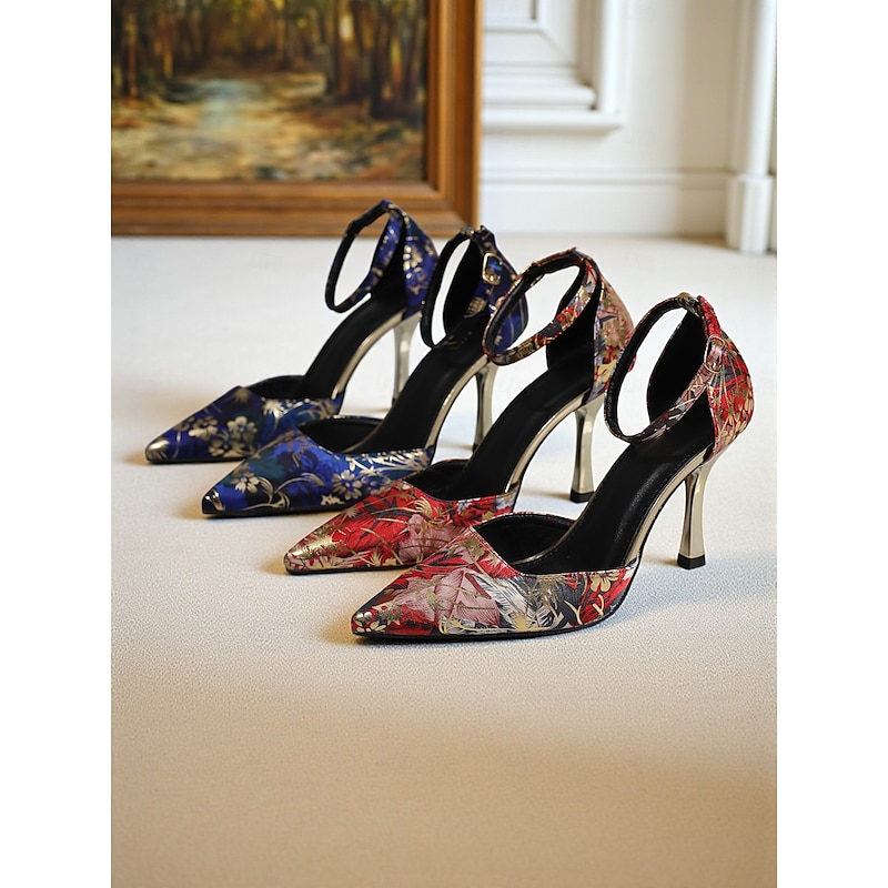 HOT ! Women's Blue Floral Brocade Pointed Toe High Heels – Elegant Ankle Strap Stiletto Pumps for Daily, Evening Party & Formal Events