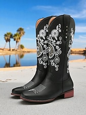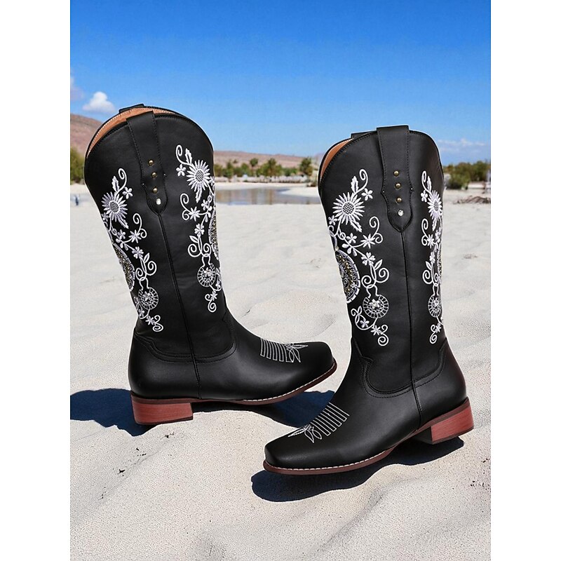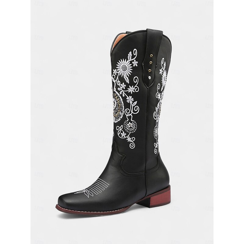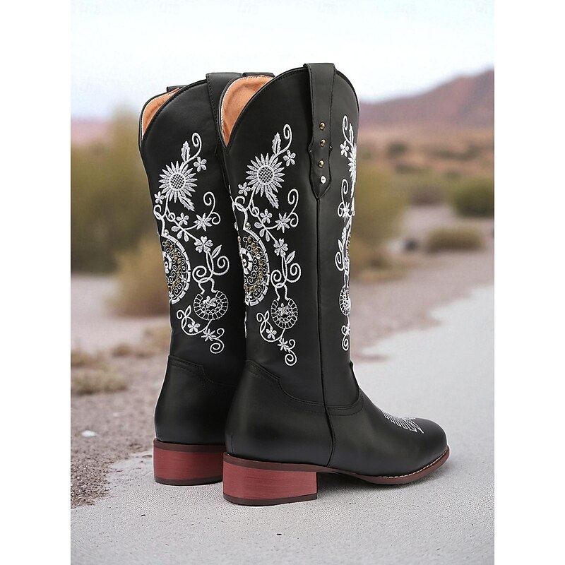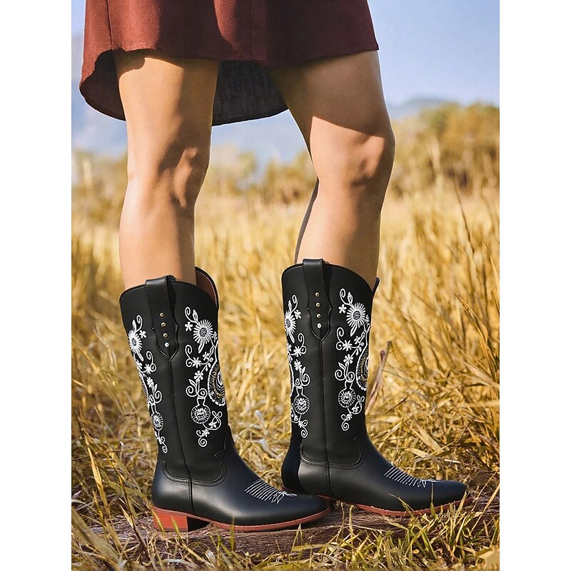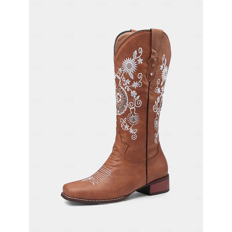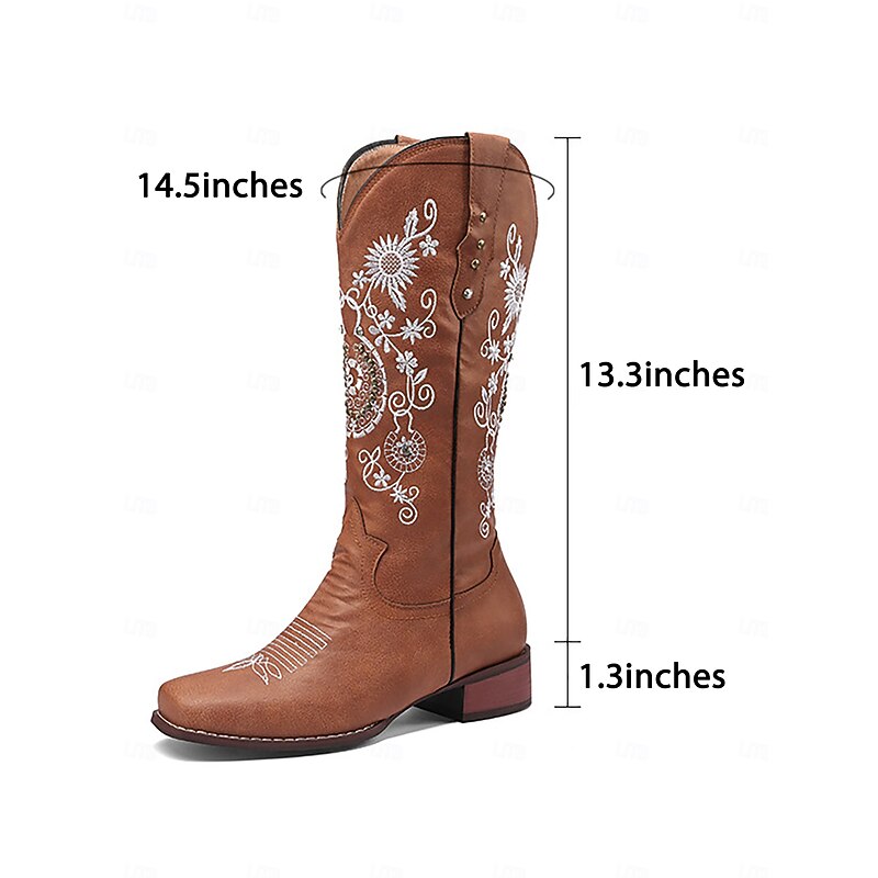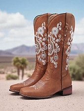 More information about Women's Brown Western Cowboy Boots with White Floral Embroidery, Square Toe and Comfortable Low Heel for Casual Country Wear