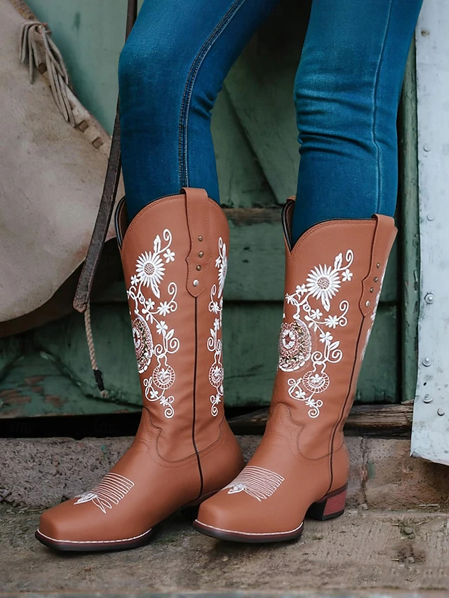 HOT ! Women's Brown Western Cowboy Boots with White Floral Embroidery, Square Toe and Comfortable Low Heel for Casual Country Wear
