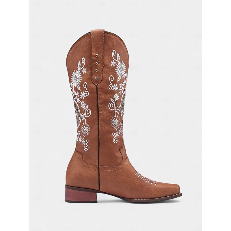 Women's Brown Western Cowboy Boots with White Floral Embroidery, Square Toe and Comfortable Low Heel for Casual Country Wear 8