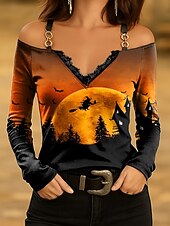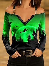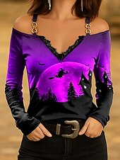 More information about Halloween Women's T shirt Witch Graphic Vintage Stylish Classic Long Sleeve V Neck Regular Tops Daily Lace Print Blue Purple Orange Green Spring Fall