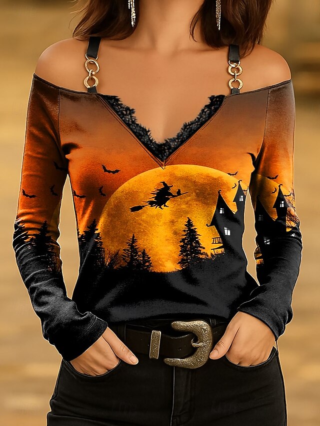 HOT ! Halloween Women's T shirt Witch Graphic Vintage Stylish Classic Long Sleeve V Neck Regular Tops Daily Lace Print Blue Purple Orange Green Spring Fall