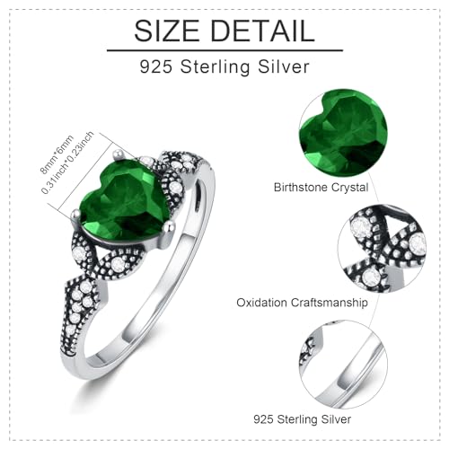 AOBOCO 2ct Vintage Birthstone Heart Ring 925 Sterling Silver Retro Oxidized Band Ring with Crystal from Austria, Birthday Anniversary Jewelry Gifts for Women Her 5