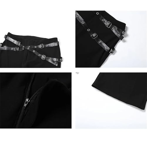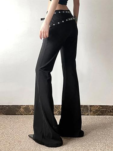 Women's Black Flared Pants Leather Buckle Waist Skinny Party Casual Pants 5
