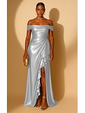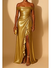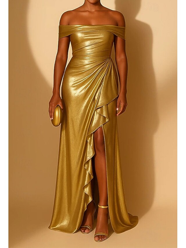 More information about Gold A-Line Lurex Fabric Evening Gown Elegant Dress Formal Wedding Sweep / Brush Train Sleeveless Off Shoulder Lurex Fabric with Ruffles Slit 2025