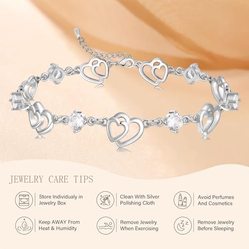 • 【Silver Bracelets for Women】Heart bracelet is made of sterling silver and engraved S925 stampt.Hypoallergenic and nickel-free,safe for most of skin types.We set this charm bracelet with gem grade 5A cubic zirconia.5A cubic zirconia is the highest grade in zirconia,which is elaborately selected from the 3A zirconia,with accurate size and cutting, reflecting the dazzling light like a diamond.