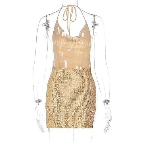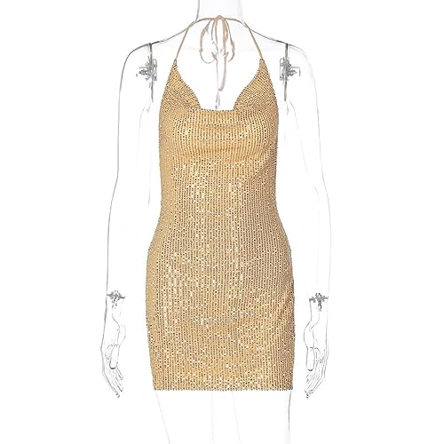 More information about Women's Sequin Halter Bodycon Mini Dress Split Hem Backless Cowl Neck Sexy Short Dress Open Back Cocktail Party Dresses