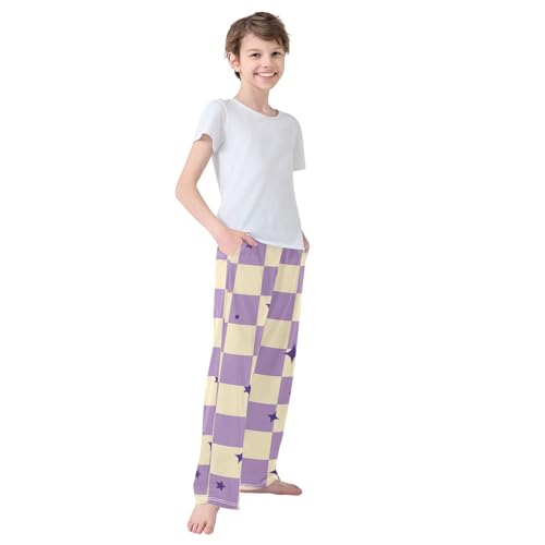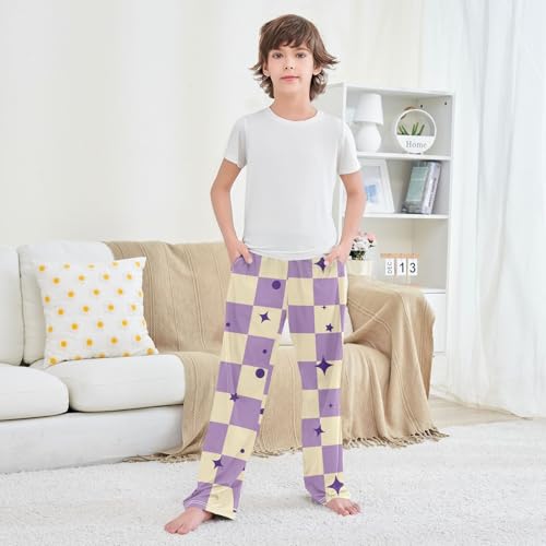 HOT ! Purple Lattice Boys Pants Boys Athletic Pants Long Pant for Boywith Pockets Wide-Leg Size 6-14Y
