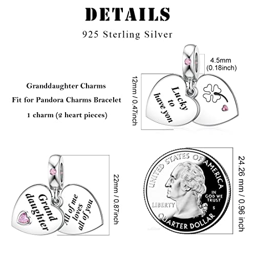 • Size: Granddaughter heart Charms:0.87 x 0.47 inch ( 22x 12 mm ), Hole: 0.17 inch (4.5 mm); Compatible with All Major Brand Bracelets Necklace, such as Pandora, Troll, Chamilia, Carlo Biagi bracelets and necklaces.