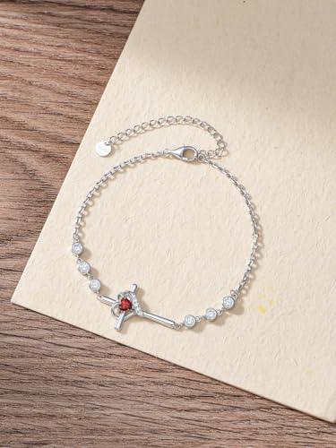 Cross Birthstone Charm Link Bracelet 925 Sterling Silver Cross Bracelet with 12 Months Birthstone Religious Christian Jewelry Gifts for Women Mom Her,Chain Length 7"+2" Extend 4