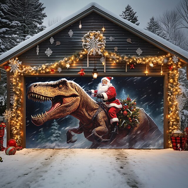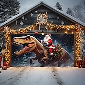 HOT ! Christmas Door Decorations Outdoor Garage Door Cover Santa Riding Dinosaur Curtain Xmas Door Banner Party Large Door Mural Backdrop Decoration forHoliday Home Wall Decorations