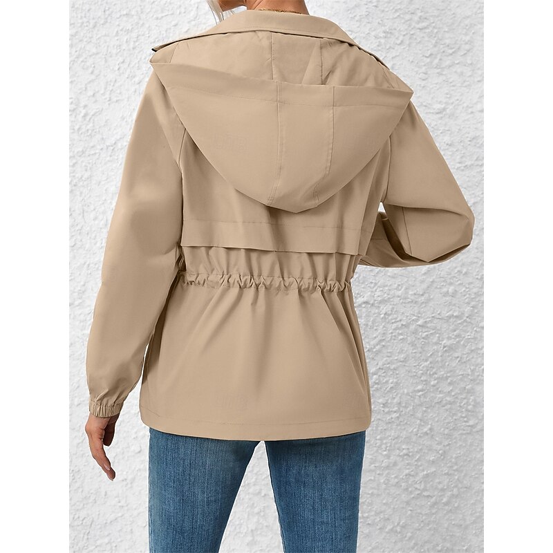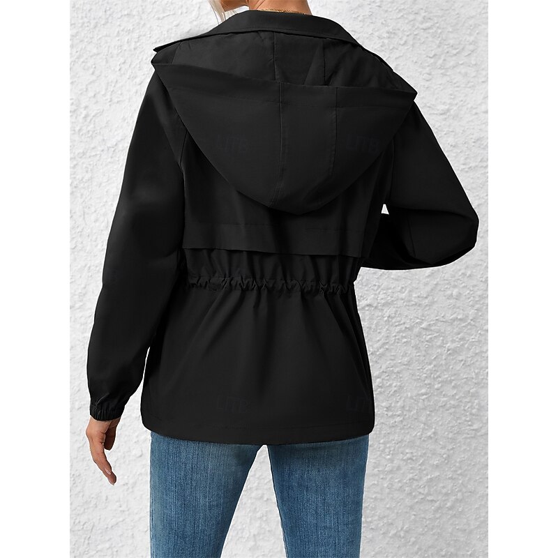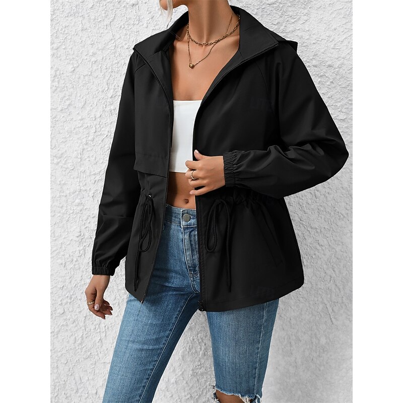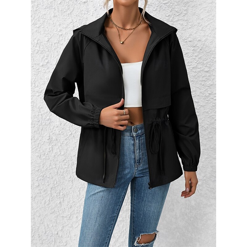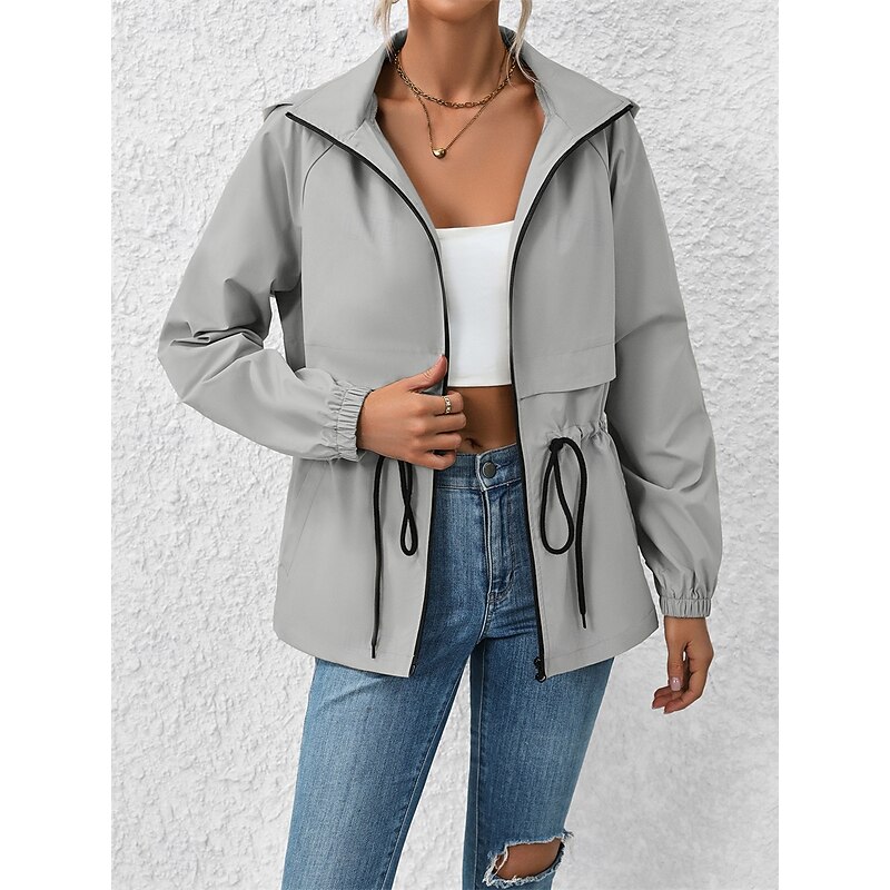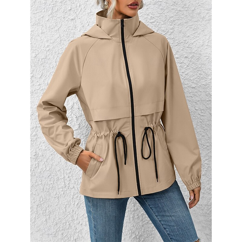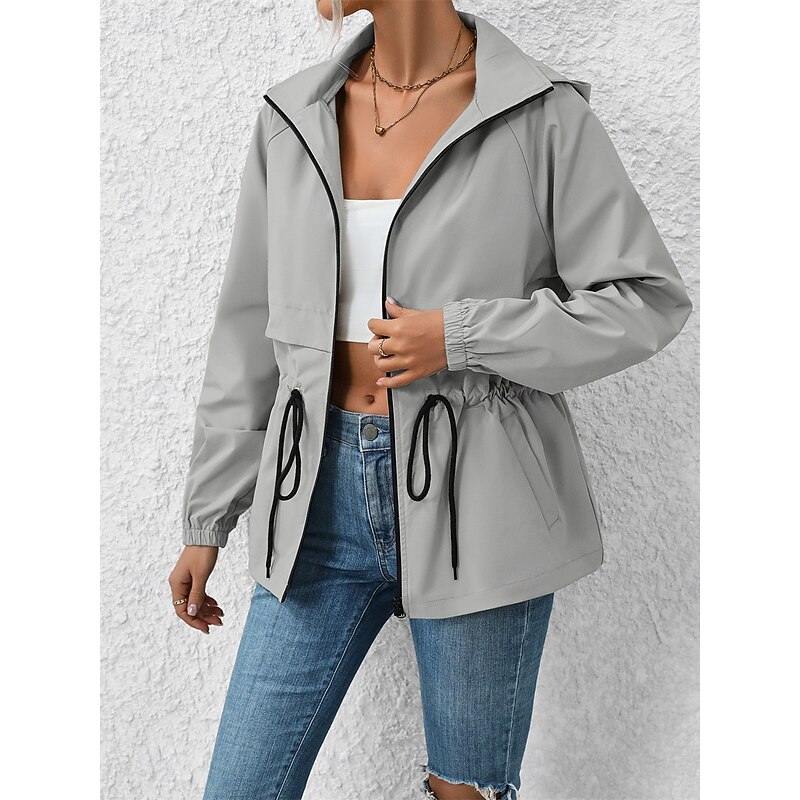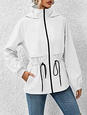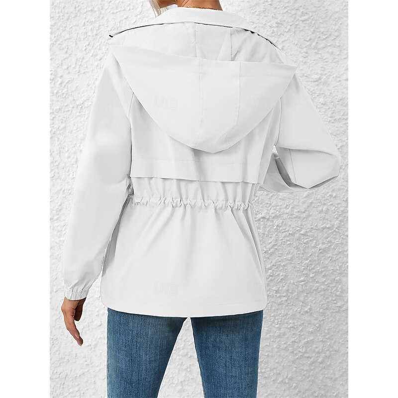 Highlights [Fabric] Crafted from high-quality Polyester Oxford fabric, this women's casual jacket boasts excellent durability and protection. The material is lightweight yet sturdy, making it ideal for withstanding various weather conditions while remaining breathable and comfortable for all-day wear. [Fit] The jacket features a regular fit with long sleeves and elasticated cuffs, ensuring a snug and comfortable fit that allows for easy movement. An adjustable drawstring waist offers a personalized fit, accentuating the silhouette for a flattering look. [Design Highlights] This stylish jacket comes equipped with a full zip-front closure and practical pockets, enhancing convenience and functionality. The spacious hood provides excellent coverage, while the plain pattern adds a touch of understated elegance to any outfit. [Occasions] Ideal for daily wear, street outings, and outdoor activities during the fall and winter months, this jacket merges practicality with contemporary style. Its waterproof and windproof capabilities make it a reliable choice for various adventures or casual gatherings. [Size Range] Available in sizes S, M, L, XL, and 2XL, and in colors white, black, gray, and coffee, catering to a wide range of preferences and body types.