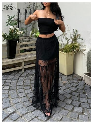 HOT ! Verdusa Women's Plus Size Sheer Lace Maxi Skirt Ruffle Hem See Through A Line Flowy Skirt
