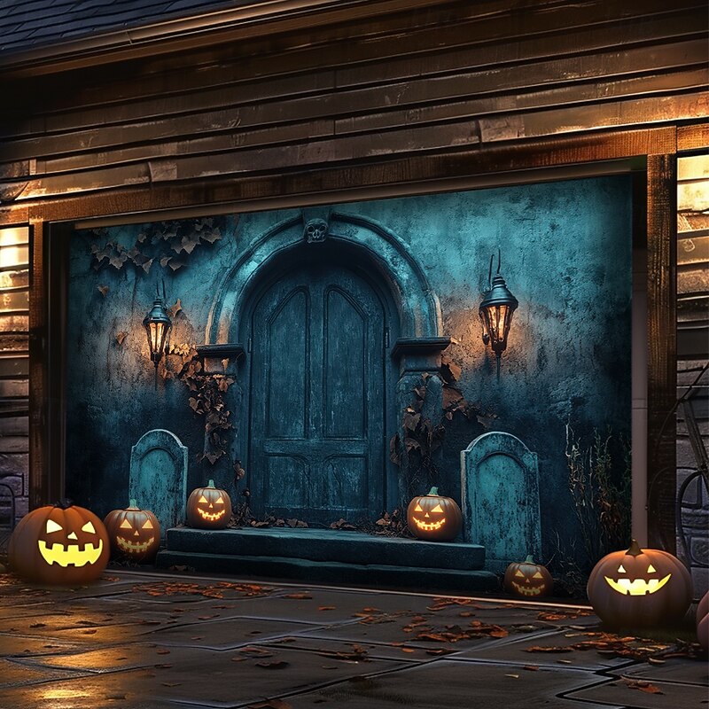 Halloween Garage Door Cover Large Hanging Backdrop Pumpkin 3D Dark Punk Gothic Style Party Outdoor Shooting Backgrounds Front Door Home Decor 12