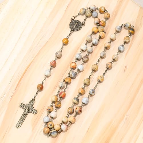 • Stone Beads: Yellow Jasper Stone Rosary features distinctive 8mm stone beads with medal and Cross of Saint Benedict. showcase natural beauty and intricate patterns.