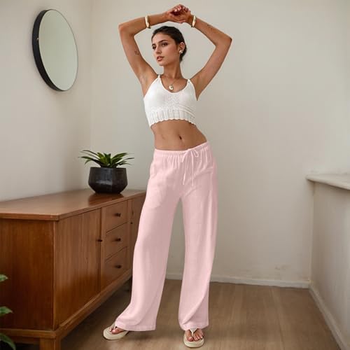 HOT ! Women Linen Pants Summer Wide Leg Pants with Pockets Boho Beach Pants High Waist Drawstring Flowy Palazzo Pants