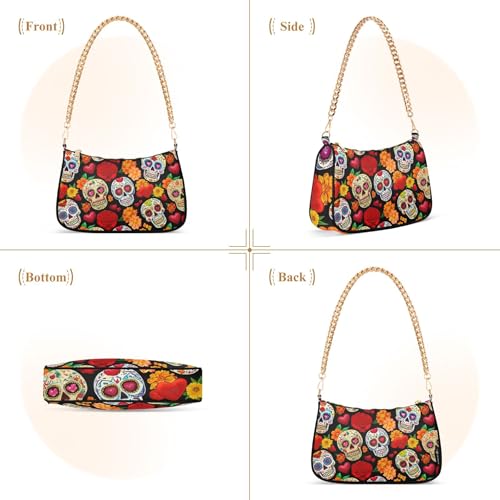 Colorful Day Dead Sugar Skulls Floral Shoulder Bag for Women Casual Purse Hobo Pattern Designer Handbags Zipper Closure