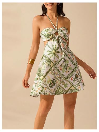 MakeMeChic Women's Summer Tropical Print Mini Dress Sundress 2025 Halter Backless Cut Out Short Dresses 6