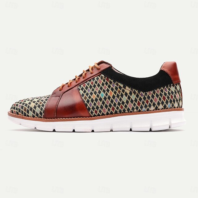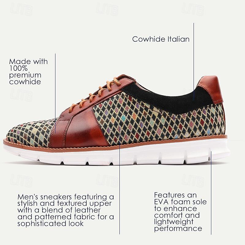Highlights [Fabric]: Crafted with a blend of high-quality leather and full-grain Italian cowhide, these men's sneakers ensure durability and a luxurious feel. The leather sections are combined seamlessly with a unique, multicolored patterned fabric, adding a touch of fashion and sophistication. [Style]: These stylish sneakers feature a classic lace-up design, allowing for a personalized fit that enhances comfort. The contemporary round toe shape combined with the ergonomic white EVA outsole provides excellent support and slip resistance, making them ideal for all-day wear. [Design Highlights]: The sneakers showcase a vibrant checkered pattern that truly stands out, with multicolor hues lending an upscale appearance. The integration of premium cowhide leather accents adds an element of traditional craftsmanship, while the sleek white sole complements the overall modern aesthetic. [Occasions]: Perfect for both casual and semi-formal occasions, these sneakers are versatile enough for a variety of settings. Whether it's a weekend outing or a smart-casual event, these shoes add a touch of elegance and charm to any outfit. [Size Range]: Available in a range of sizes, from US8 / EU41 / UK7 to US13 / EU46 / UK12, ensuring a suitable fit for a broad audience.