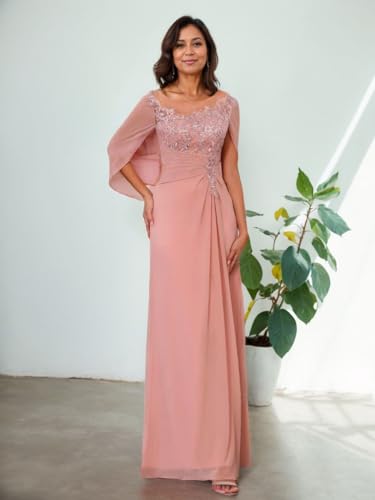 HOT ! Cape Scoop Neck Mother of The Bride Dresses for Women Lace Appliques Chiffon Formal Evening Gown with Fake Sleeves