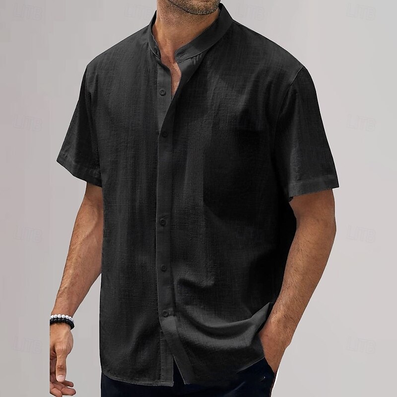 HOT ! Men's Cotton Linen Shirt Plain Vacation Black White Sky Blue Khaki Short Sleeve Grandad Collar Summer Clothing Apparel