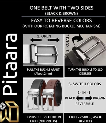• PRACTICAL & STYLISH: Made with finest quality leather on both sides, our reversible belts in crossline pattern come with a stainless steel swivel buckle that will allow you to switch sides and choose between black and brown with ease, hence making it a perfect belt for all types of looks and occasions.
