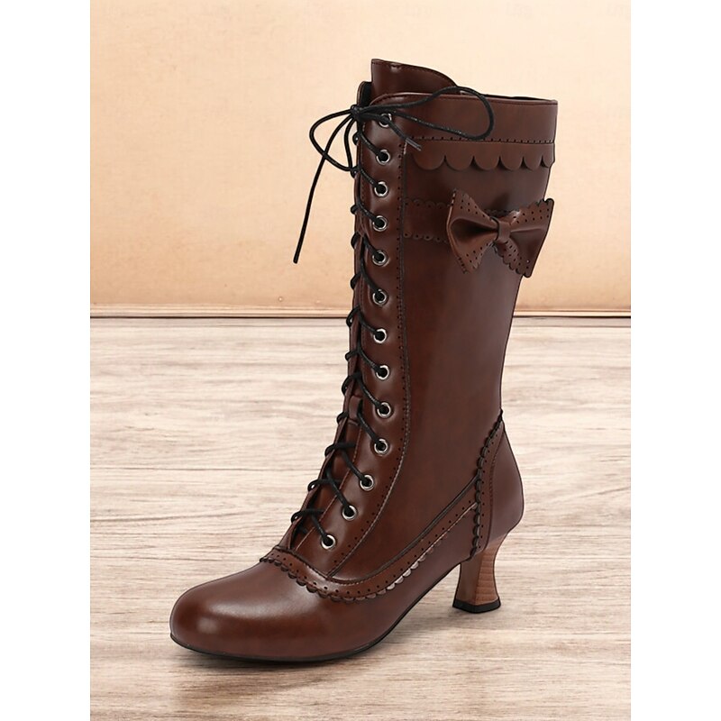 Women's Brown Vintage Lace-Up Knee-High Boots with Bow Detail – Retro Heeled Faux Leather Victorian Boots for Cosplay & Everyday Wear