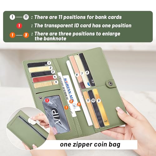 WishLotus Slim Wallet for Women, Bifold PU Leather Long Rfid Blocking Wallet Large Capacity Credit Card Wallet with ID Window Coin Zip Pocket Credit Card Holder for Men (Green) 5