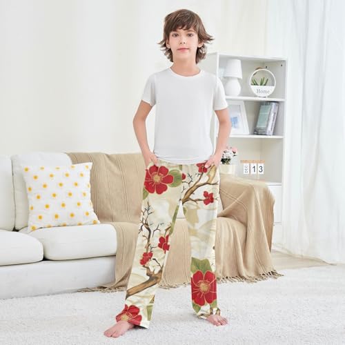 Plum Tree Print Boys Long Pants Soft Trousers Elastic Waist Kids Lounge Bottoms with Pockets S-XL 4