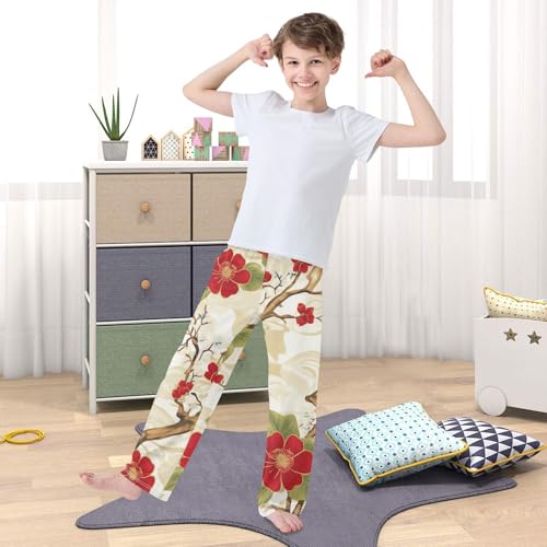 Plum Tree Print Boys Long Pants Soft Trousers Elastic Waist Kids Lounge Bottoms with Pockets S-XL 1