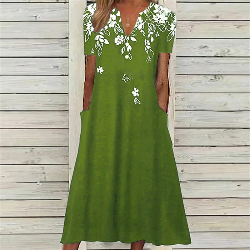 Highlights [Fabric] : Crafted from lightweight and breathable polyester, this dress ensures comfort throughout spring, summer, and fall. Its micro-elastic property gives a slight stretch for ease of movement and a relaxed fit. [Silhouette] : The dress features an A-line silhouette that flatters all body types, offering a regular fit that drapes elegantly to a midi or calf length. Its flowing design is perfect for creating a graceful, feminine look. [Design Highlights] : Adorned with a delicate floral print in navy blue, this dress is accented by a split V-neckline that adds a stylish touch. The short sleeves provide a comfortable fit, while discreet pockets on the sides add practical functionality to its chic appearance. [Occasions] : Suitable for a variety of occasions, this dress is perfect for casual outings, beach days, vacations, or any relaxed setting where style and comfort are essential. Its versatile design makes it ideal for dates, holidays, and daily wear during warm weather. [Size Range] : Available in sizes ranging from S to 3XL, this dress accommodates a wide range of body types, ensuring a suitable fit for everyone seeking both fashion and comfort.