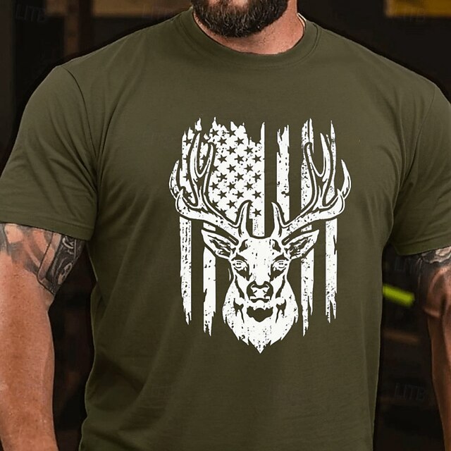 HOT ! Men's American US Flag Hunting Deer T Shirt Tee Top 100% Cotton Short Sleeve Graphic Shirt Heather Gray White Army Green Comfortable Tee Street Camping & Hiking Fashion Designer Clothing