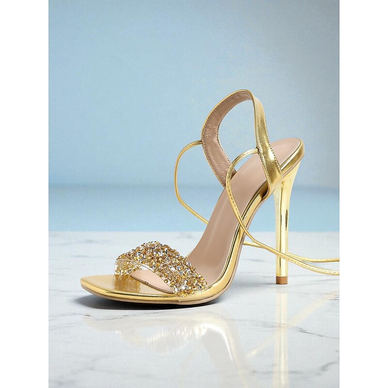 HOT ! Women's Gold Lace-Up Stiletto Heels with Rhinestone Straps - Glamorous High Heel Sandals for Nightclub Parties and Special Events