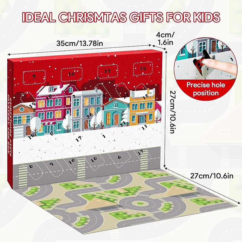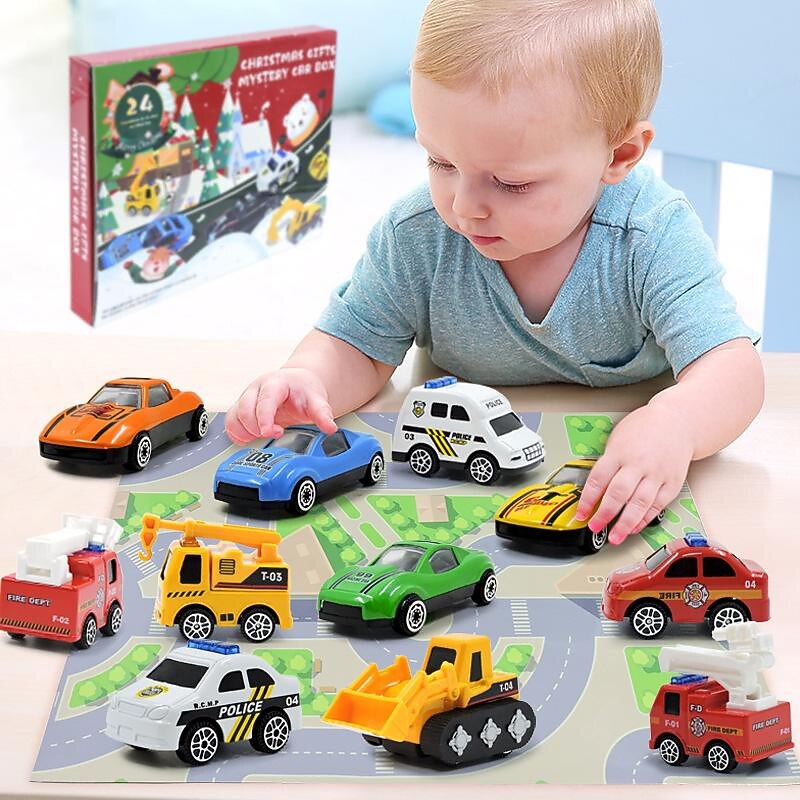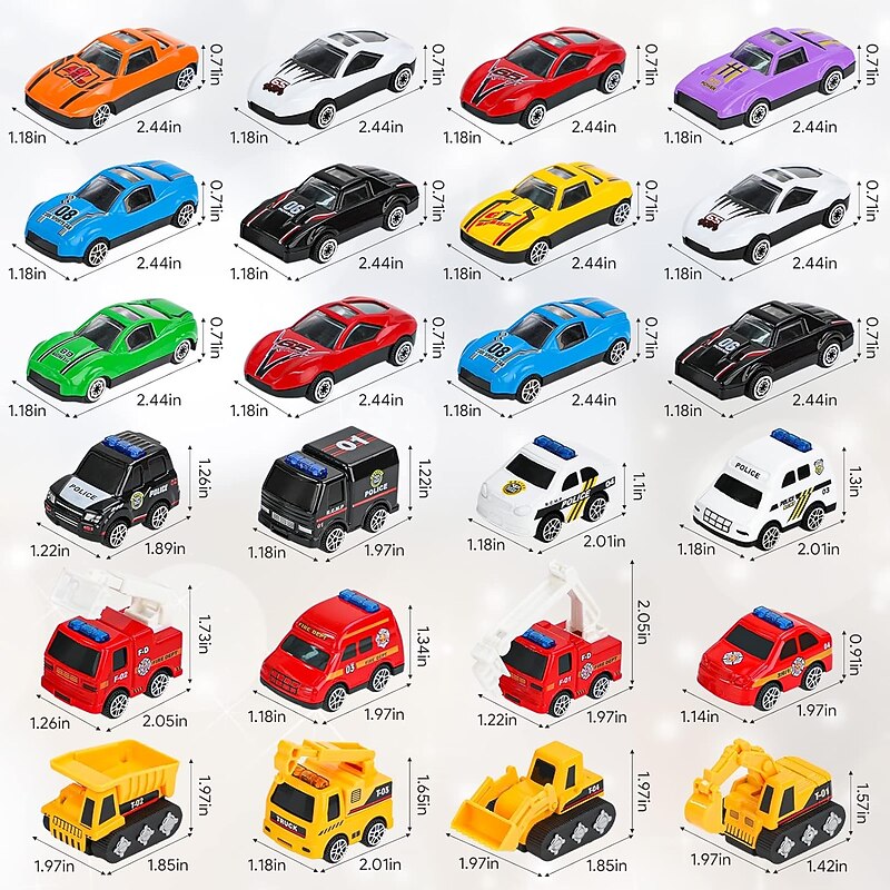 - 24 DAYS CHRISTMAS COUNTDOWN TOY: This Christmas calendar car toy comes with 24 exquisite alloy cars, including private cars, Police cars, fire engine, and construction vehicles. Each square on the built-in car walking map is labeled with a random number from 1-24, making it a fun and interactive countdown to Christmas.