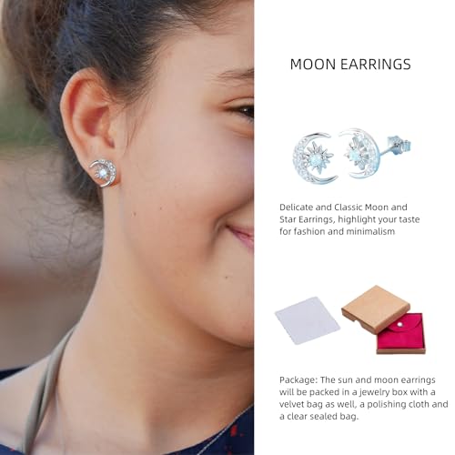 HOT ! Moon and Star Earrings 925 Sterling Silver Opal Stud Earrings for Women Hypoallergenic Sun and Moon Earrings Crescent Moon Star Jewelry Gift for Women for Sensitive Ears
