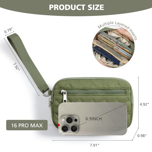 • COMPACT SIZE: 7.9" x 4.7" x 1" and detachable 7.1" wrist strap. Perfectly for holds Large-screen Smartphone, credit cards, cash, coins, etc. Allow to carry your essentials all-in-one to free your hands for other activities