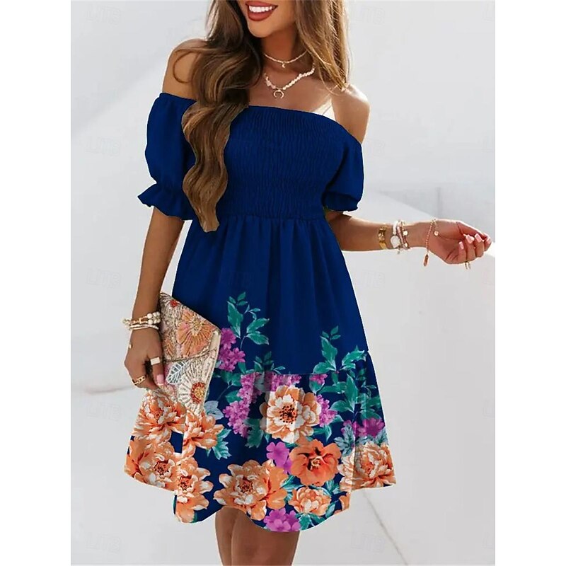 Highlights [Fabric] : Crafted from breathable polyester, this mini dress offers a lightweight and airy feel, perfect for hot summer days. The fabric's micro-elasticity ensures a comfortable fit, making it ideal for daily wear. [Fit] : The dress features a regular fit with a smocked bodice that provides flexibility and comfort. It accentuates the off-shoulder style, while the half sleeves and tiered skirt design create a relaxed and playful silhouette. [Design Highlights] : This stylish dress boasts an off-shoulder neckline and a vibrant floral and leaf print, complemented by a stunning color gradient from blue to pink. The backless design adds a hint of allure, and the puffed half sleeves lend a feminine and elegant touch. [Occasions] : A versatile addition to any wardrobe, this dress suits a range of occasions from casual daily wear to vacation outings. It's perfect for a day at the beach or a summer getaway, effortlessly combining style and comfort. [Sizes] : Available in a variety of sizes from S to 2XL, this dress caters to different body types, offering a stylish fit for a wide range of customers.