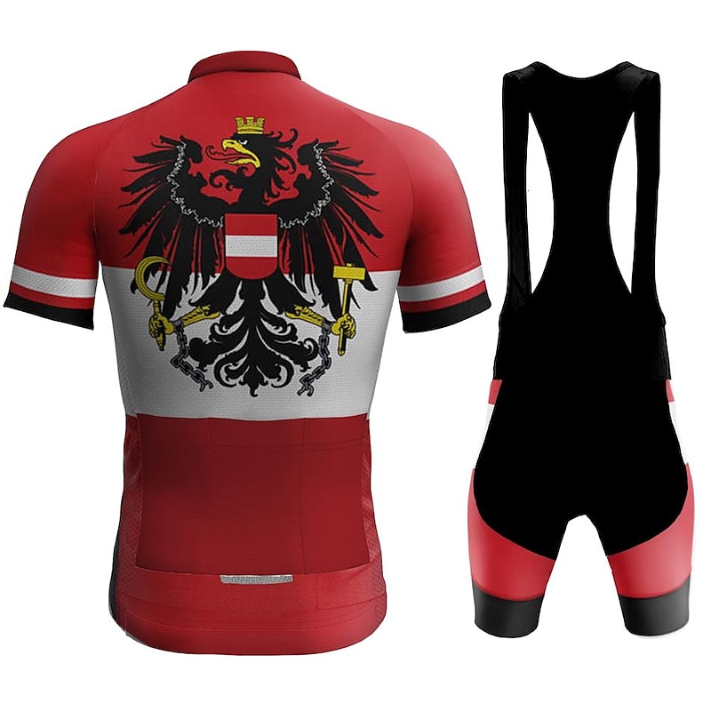 Highlights - Made of 100% polyester, this cycling shirt is designed to offer superb wicking and breathability, ensuring that sweat is moved away from your body to quickly evaporate, leaving you feeling dry and comfortable even during intense cycling. - Boasting 3 pockets, this cycling jersey is highly practical, with a zippered security pocket on the front and 3 rear pockets for storing multi-tools, snacks, and other mid-ride essentials. - Offering a loose fit, this bike jersey is supremely comfortable on and off the bike, while a longer elastic rear hem provides extra coverage that ensures you are always well-covered. - Equipped with reflective strips on both the front and back, this cycling jersey is designed to improve your visibility when riding in poor light, with bright colors helping motorists see you and keeping you safe for day and night cycling. - Made from spandex and stretchy for added comfort, this jersey is perfect for both road bike and mountain bike cycling, while its classic design ensures it looks good off-the-bike, making it ideal for leisure cycling and urban cycling too. - With its Austria pattern, this cycling jersey is perfect for men athletes looking for a quick-dry and moisture-wicking outfit that can withstand even the toughest mountain bike or road bike rides.