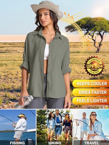 Womens UPF 50 Long Sleeve Sun Shirt Safari Hiking Quick Dry UV Protection Button Up Travel Shirt for Fishing Gardening Africa 1