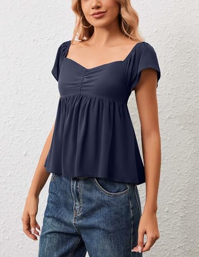 HOT ! Women Sweetheart Neck Ruched Bust Peplum Hem Tank Top Ruffled Cap Sleeve Smocked Back Solid Flowy Tshirt Tops