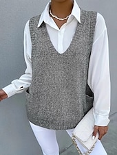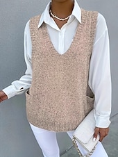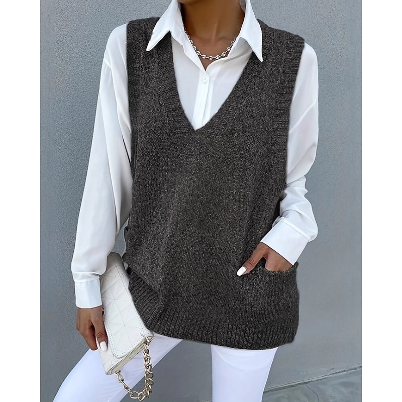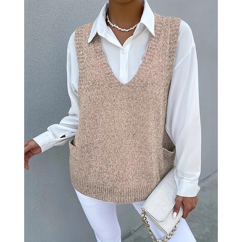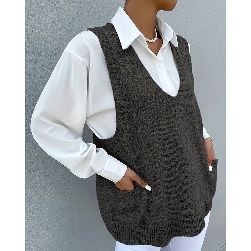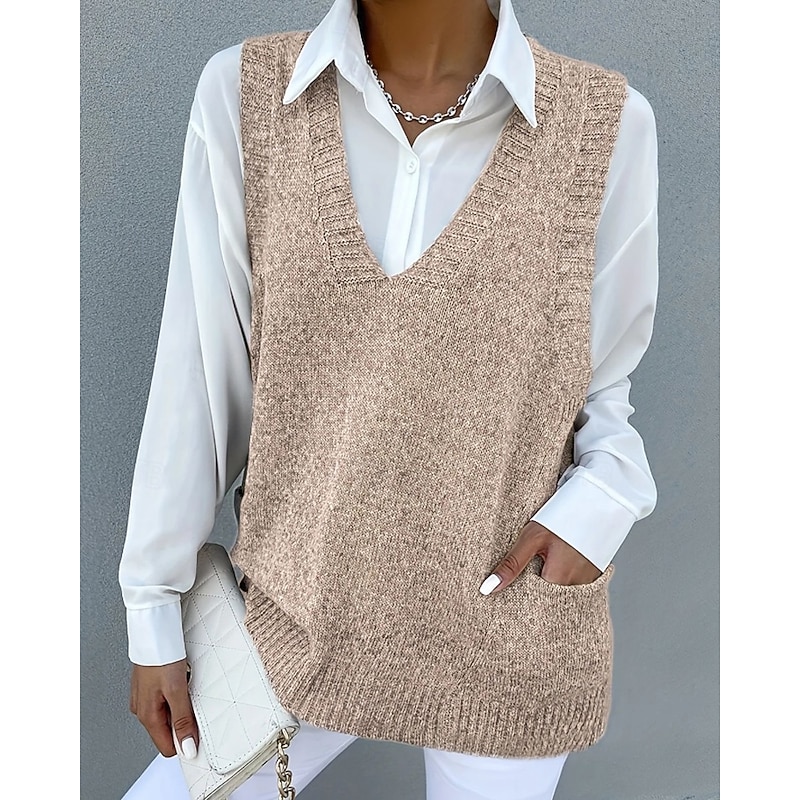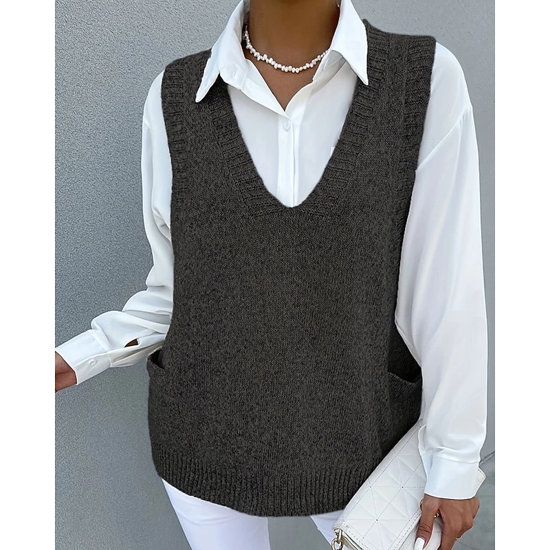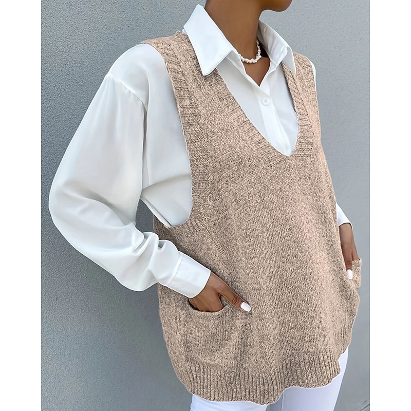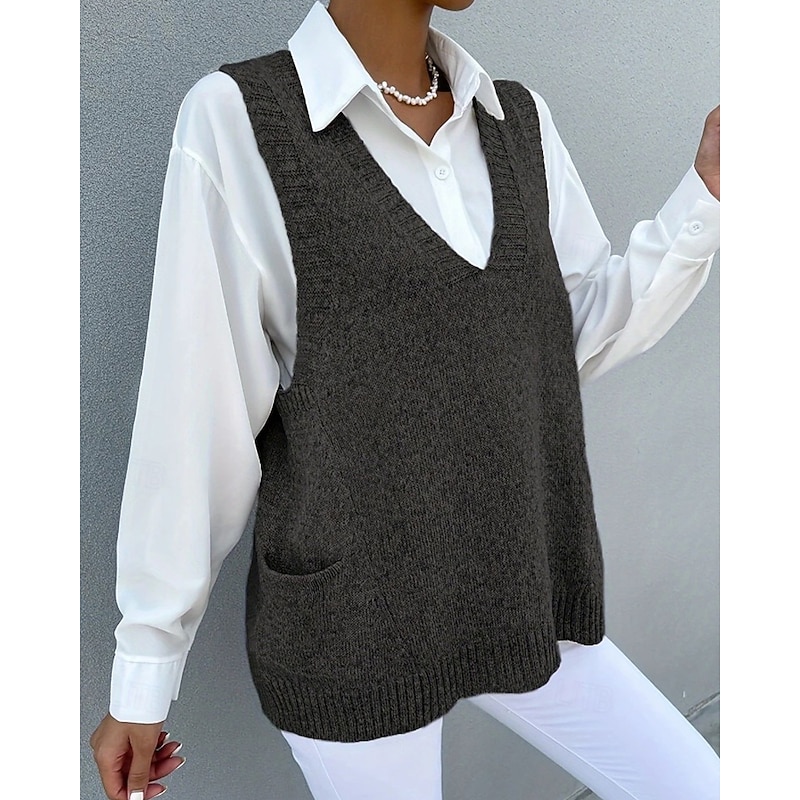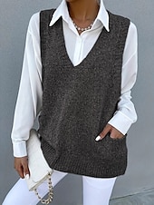 More information about Women's Sweater Sweater Vest Streetwear Casual Solid Color V Neck Pocket Knitted Sleeveless Regular Tops Knit Daily Holiday Going out Black Khaki Fall Winter
