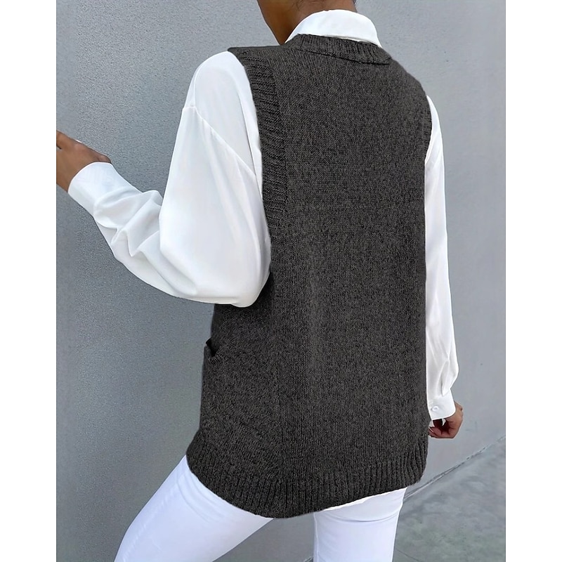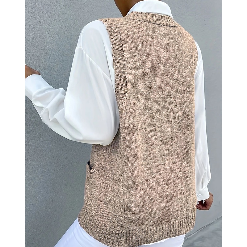 HOT ! Women's Sweater Sweater Vest Streetwear Casual Solid Color V Neck Pocket Knitted Sleeveless Regular Tops Knit Daily Holiday Going out Black Khaki Fall Winter
