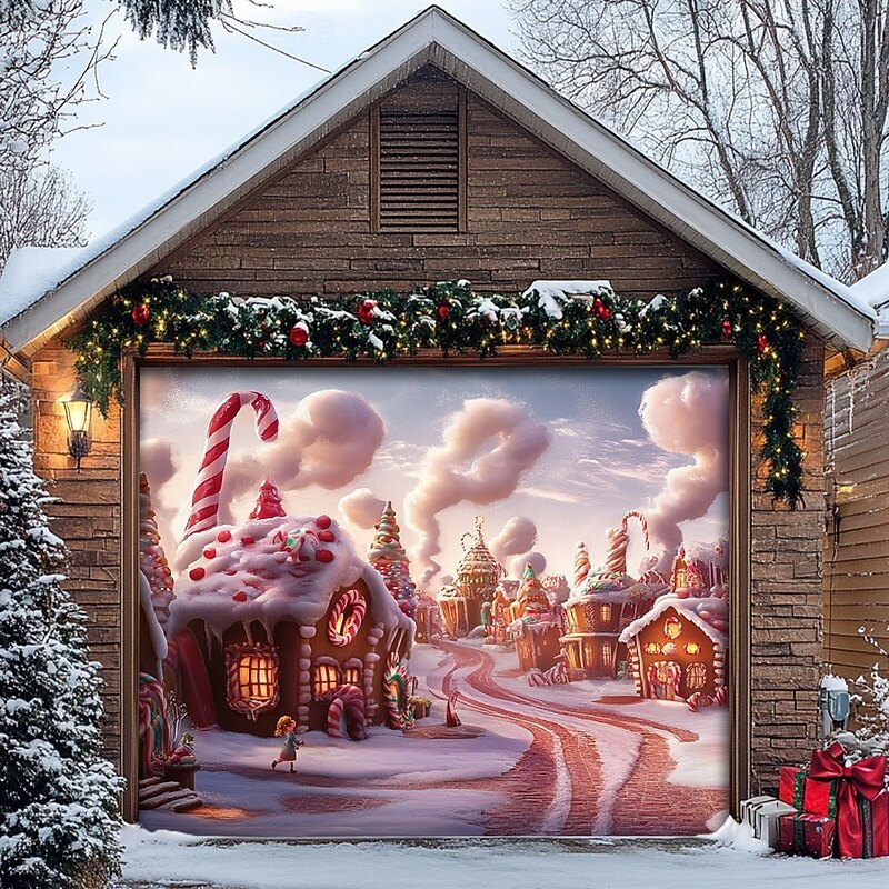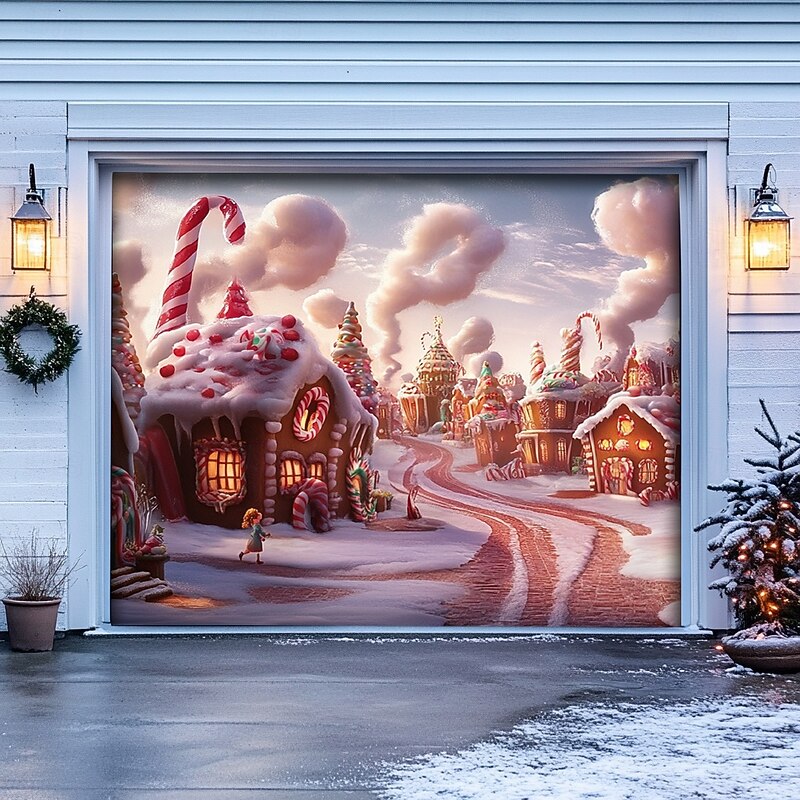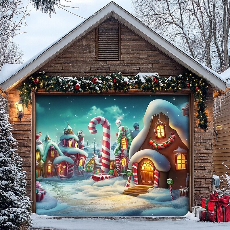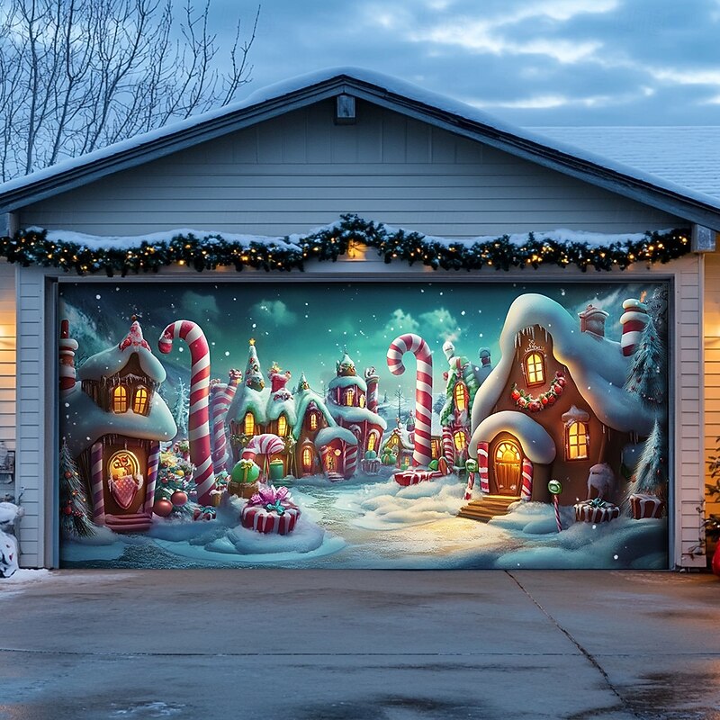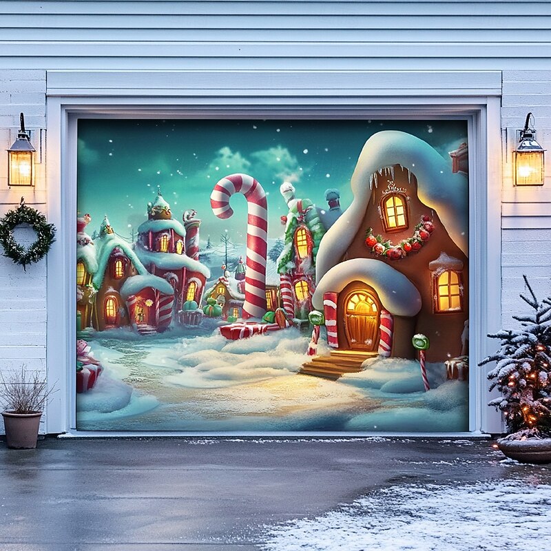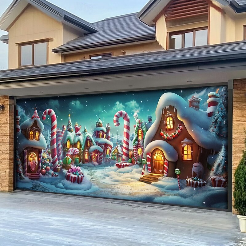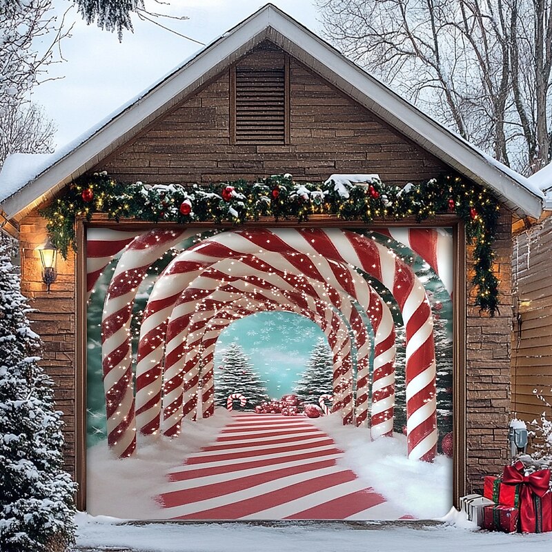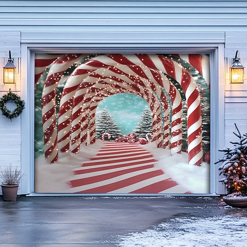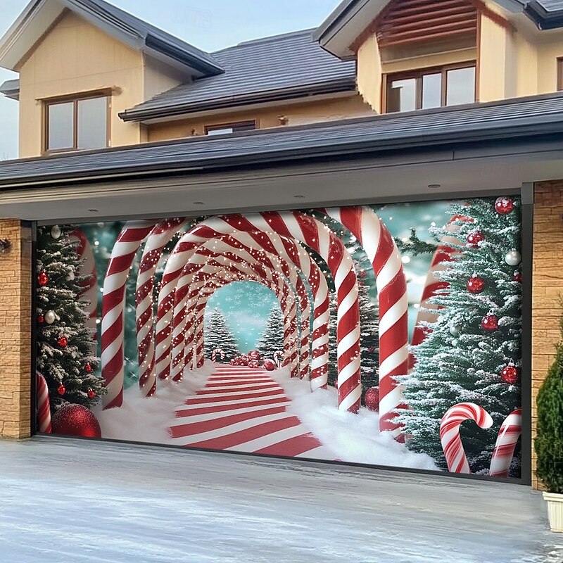 HOT ! Christmas Door Decorations Outdoor Garage Door Cover Xmas Candy Canes Banner Farmhouse Large Christmas Backdrop for Holiday Outdoor Garage Door Home Wall Decorations