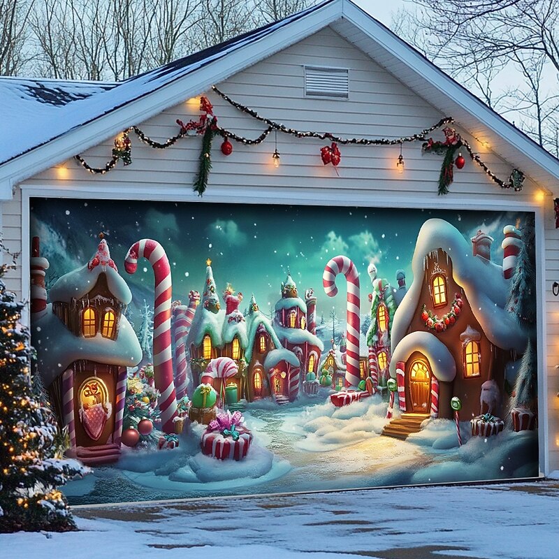 Christmas Door Decorations Outdoor Garage Door Cover Xmas Candy Canes Banner Farmhouse Large Christmas Backdrop for Holiday Outdoor Garage Door Home Wall Decorations 19