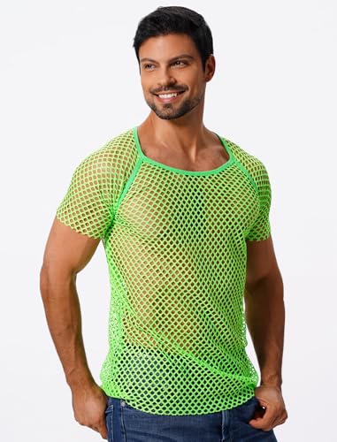 • Fishnet Muscle Shirt Tank Top For Men: Men's short sleeve sheer fishnet mesh tees mesh tank top men slim fit summer cool breathable workout gym sports tee shirt undershirt nightclub nightwear.