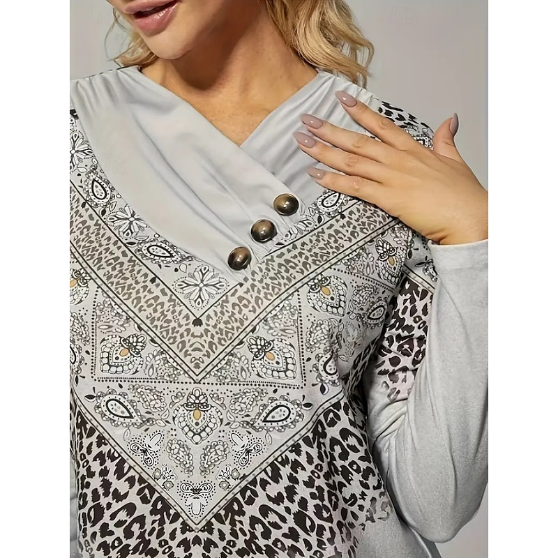 Women's T Shirt Graphic Striped Vintage Stylish Casual Long Sleeve V Neck Regular Tops Daily Weekend Buttons Print Light Green Blue Green Gray Fall Winter 13