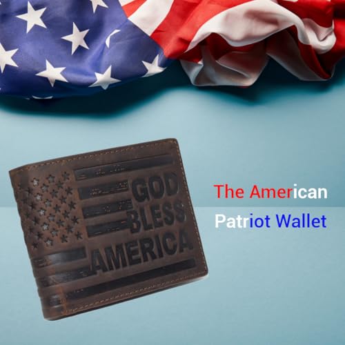 HOT ! Distressed Vintage Leather Patriot American Flag Wallet -GOD BLESS AMERICA’ RFID Blocking Leather US Flag Men's Bifold Western Style Wallet (Brown)