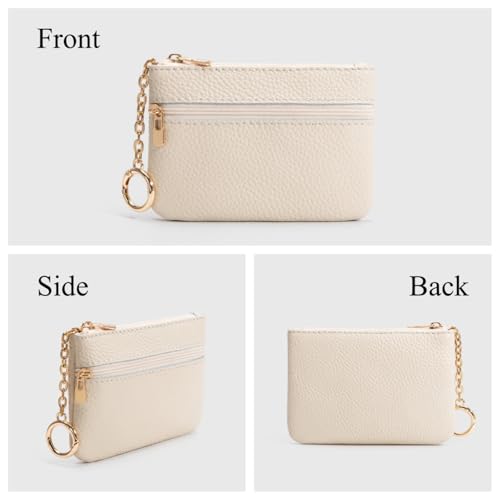 Full Grain Leather Coin Purse with Keychain - 2 Zippered Pockets Mini Coin Pouch Card Holder Keychain Pouch Keychain Wallet - Small Change Purse for Women and Men (Off White) 5