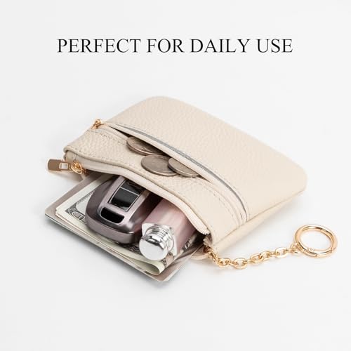 Full Grain Leather Coin Purse with Keychain - 2 Zippered Pockets Mini Coin Pouch Card Holder Keychain Pouch Keychain Wallet - Small Change Purse for Women and Men (Off White) 4