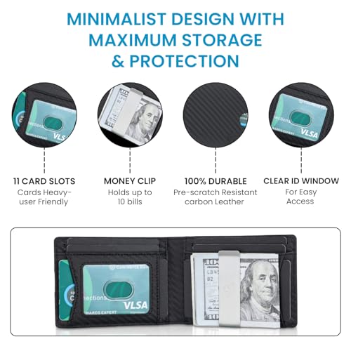 HOT ! Mens Wallet | 11 Credit Card Holder | Built-In Money Clip | Slim Minimalist | RFID Blocking | Premium Leather | Gift for Him, Carbon, SNM097